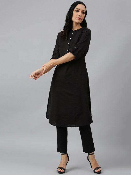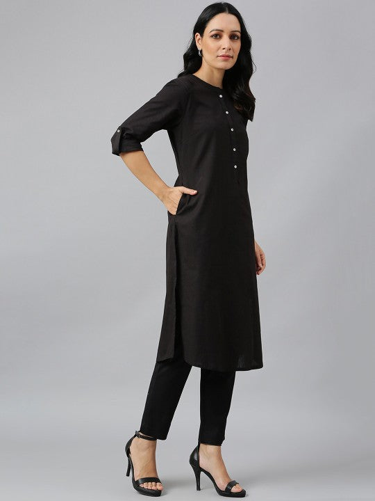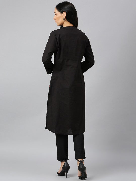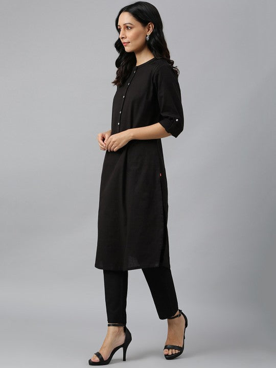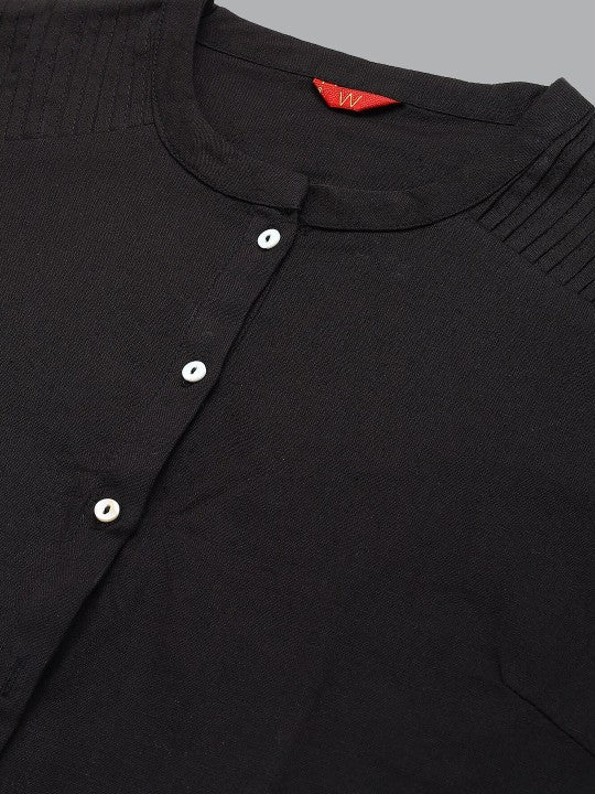 W Women Black Solid Mandarin Collar Cotton Kurta