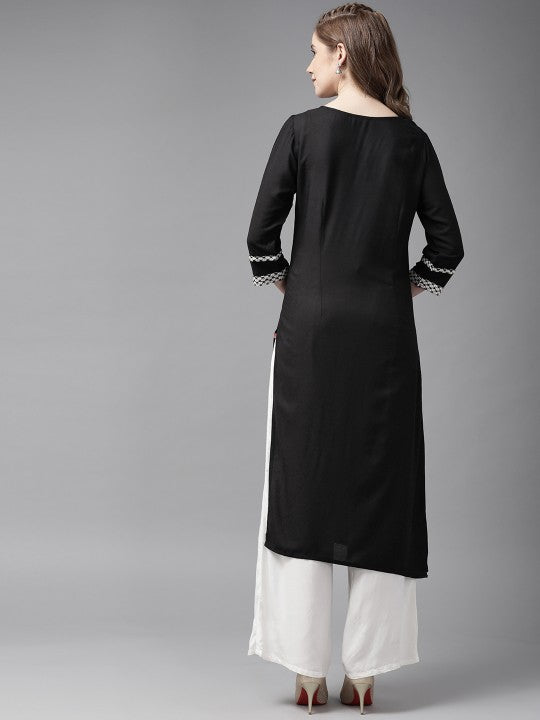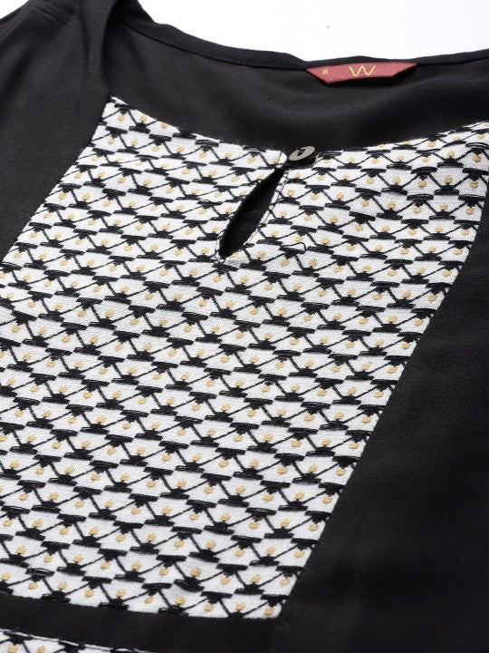 W Women Black & White Geometric Yoke Design Keyhole Neck Thread Work Kurta