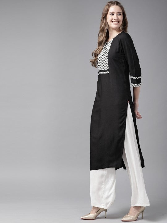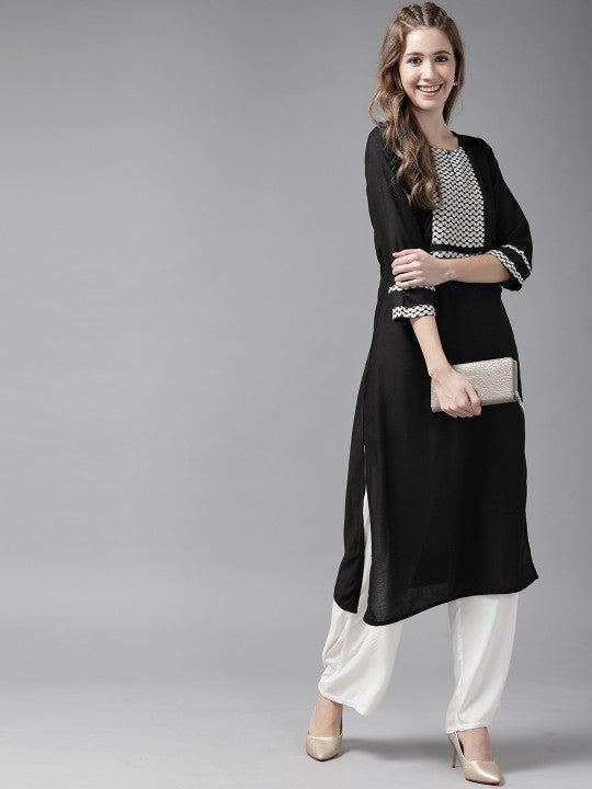 Product Details: Colour: Black and White Geometric yoke design Keyhole neck Three-quarter, regular sleeves Straight shape with regular style Thread work detail Calf length with straight hem Machine weave regular viscose...