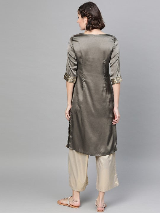 - Charcoal grey and golden satin finish printed straight kurta, has a keyhole neck, three-quarter sleeves, straight hem, and side slits