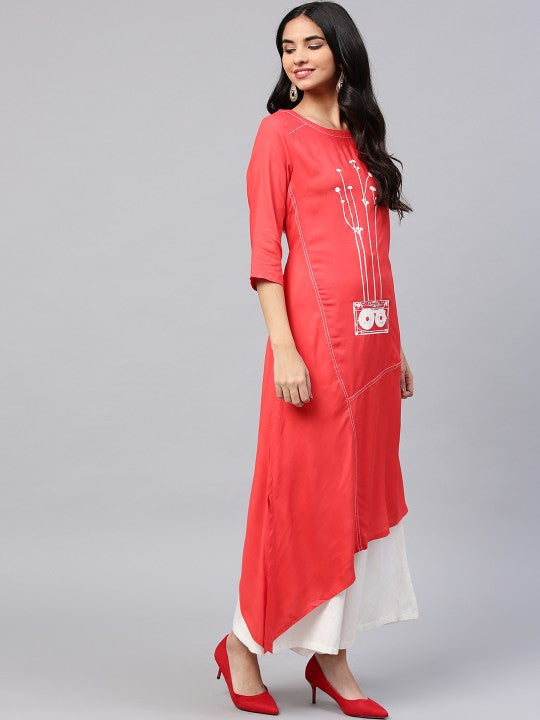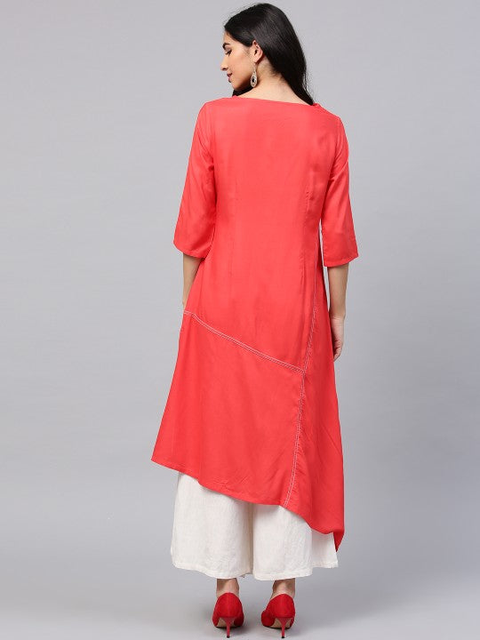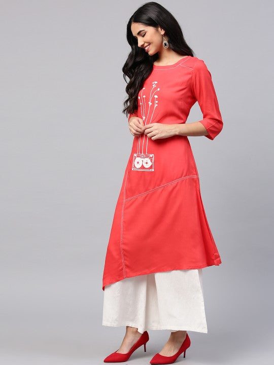 Product Details: Coral pink Quirky Print A-line kurta, has a round neck, three-quarter sleeves, asymmetric hem, side slits Material & Care: Fabric: 100% Viscose Rayon Fabric Type: Liva Hand-wash