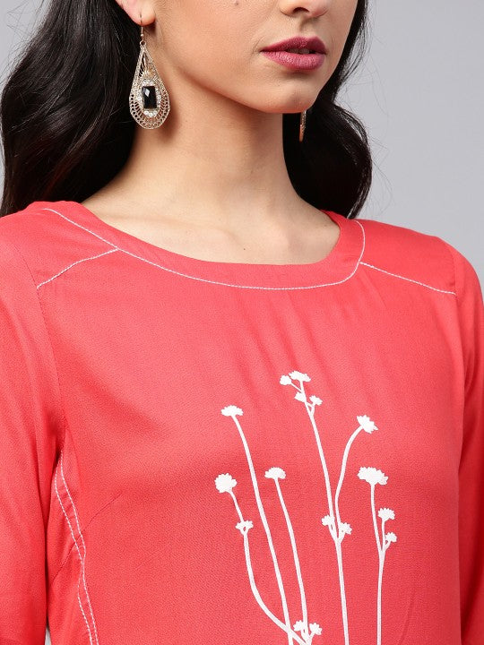 - Coral pink Quirky Print A-line kurta, has a round neck, three-quarter sleeves, asymmetric hem, side slits