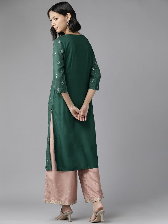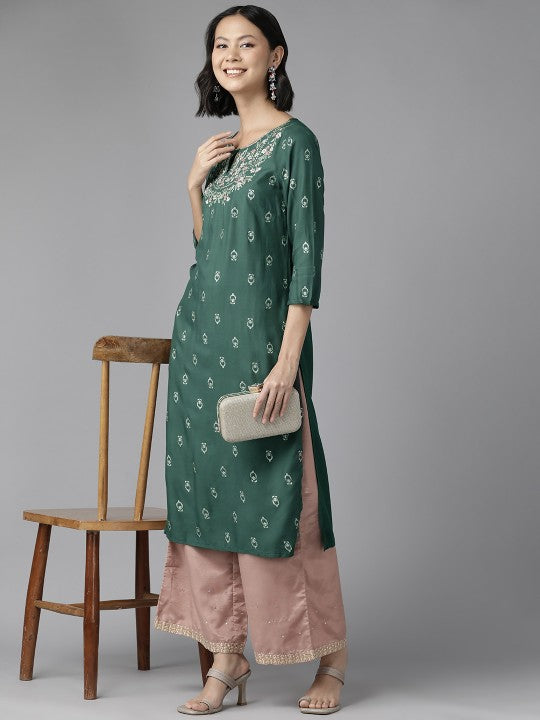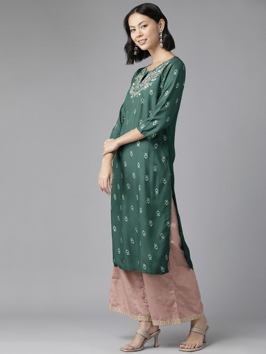 Product Details: Colour: Green and Golden Ethnic motifs embroidered Keyhole neck Three-quarter, regular sleeves Straight shape with regular style Thread work detail Calf length with straight hem Machine weave regular viscose...