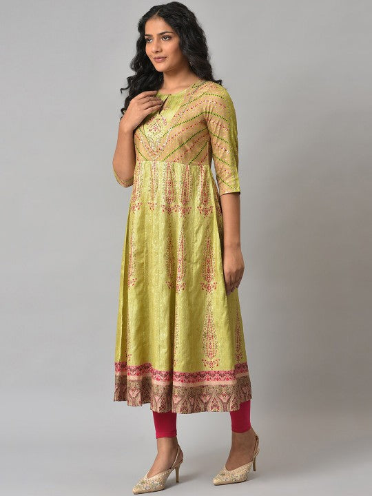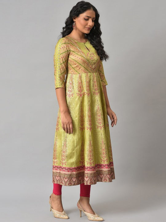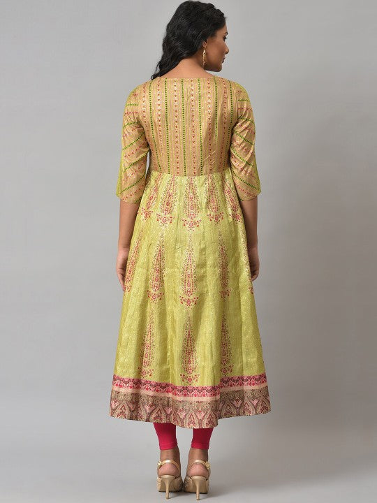 W Women Festive Floral Print Karnataka Silk Anarkali Kurta With Leggings