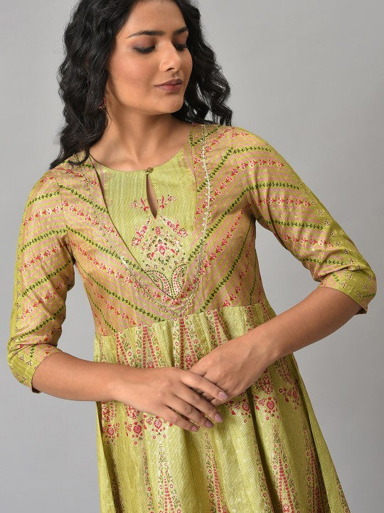 Product Details: Green printed Kurta with Leggings Kurta design: Floral printed A-line shape Regular style Keyhole neck, three-quarter regular sleeves Calf length length with flared hem Polyester knitted and woven fabric...