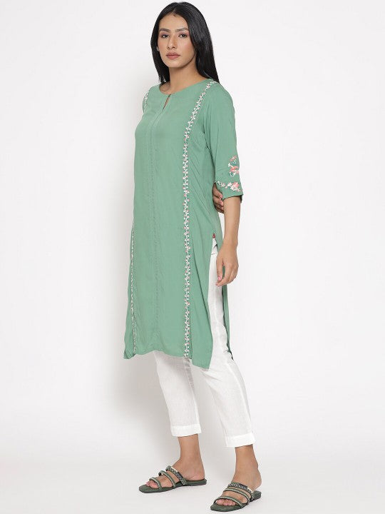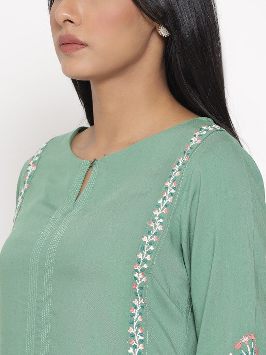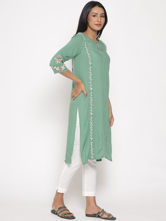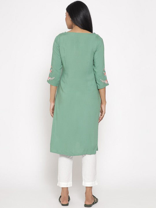 Product Details: Colour: Green Floral embroidered Keyhole neck Three-quarter, regular sleeves Straight shape with regular style Thread work detail Knee length with straight hem Knitted and woven regular viscose rayon Material...