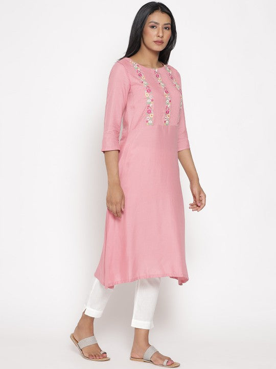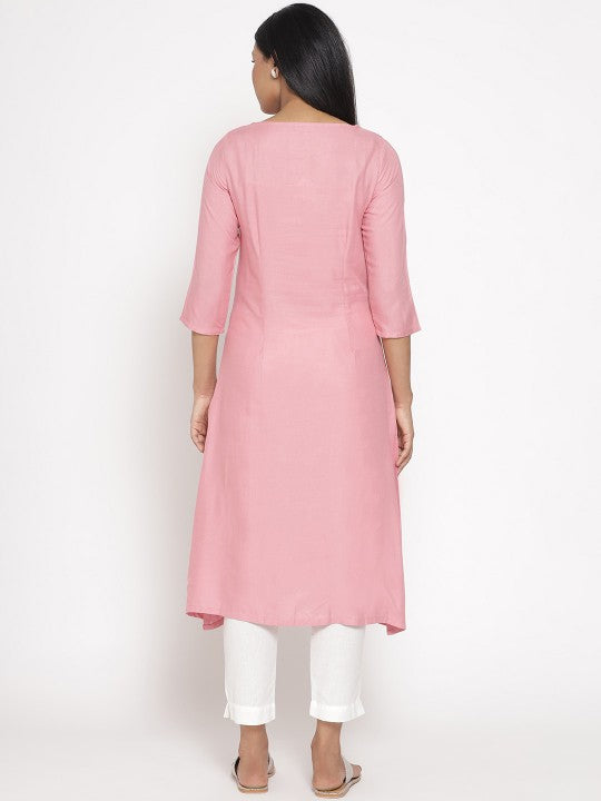 Product Details: Floral embroidered Round neck Three-quarter, regular sleeves A-line shape with panelled style Thread work detail Calf length with asymmetric hem Knitted and woven regular viscose rayon Material & Care:...
