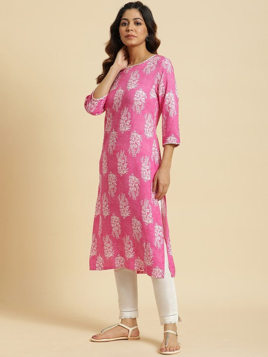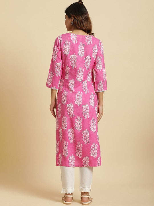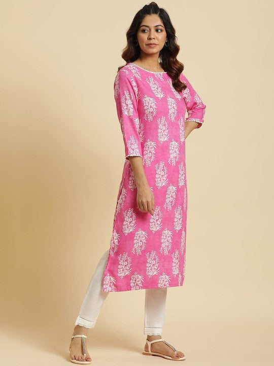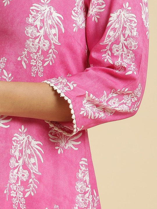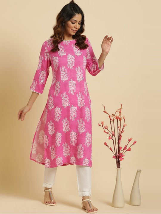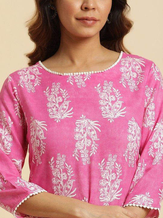 Product Details: Colour: Pink Floral printed Round neck Three-quarter, regular sleeves Straight shape with regular style Calf length with straight hem Knitted and woven regular cotton Material & Care: Viscose Rayon...