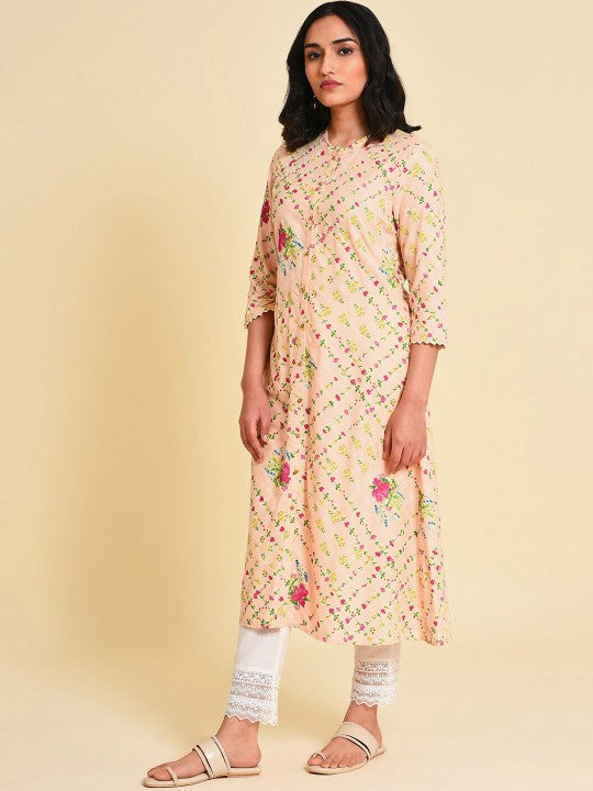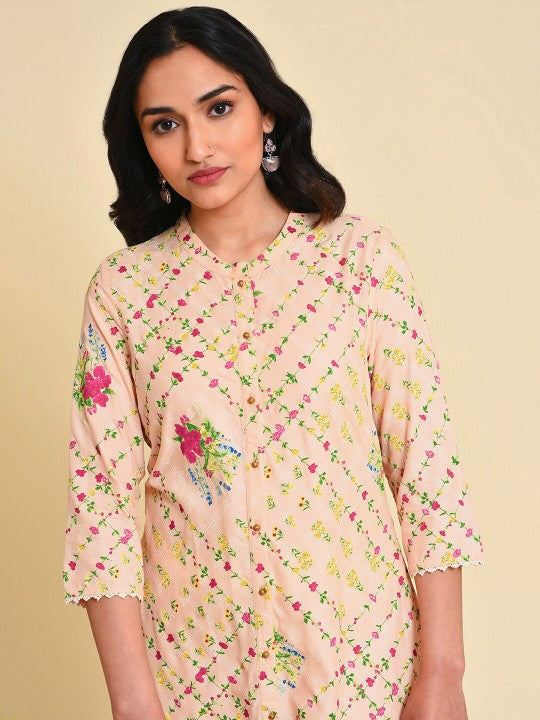 Product Details: Peach and White printed Kurta with Trousers Kurta design: Floral printed A-line shape Regular style Band collar, three-quarter regular sleeves Thread work detail Calf length with straight hem Viscose...