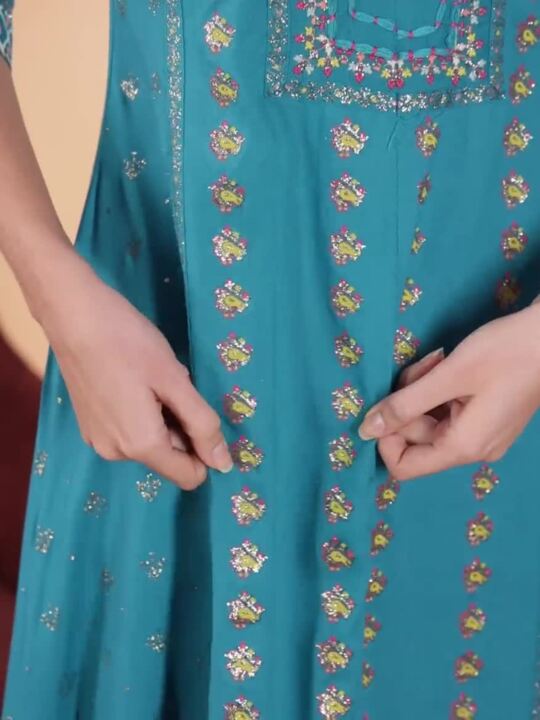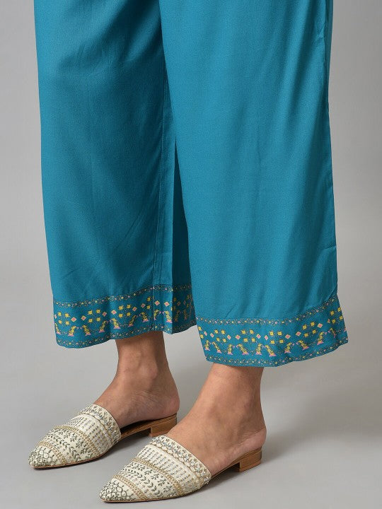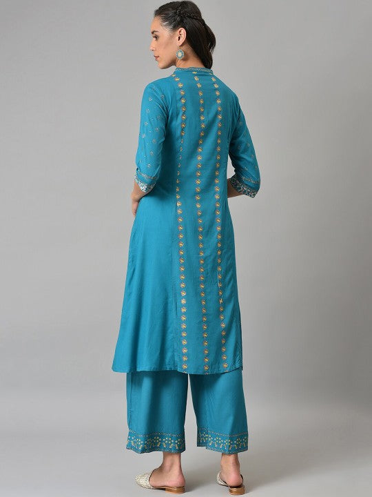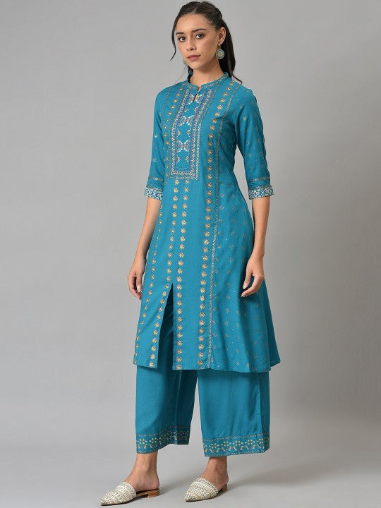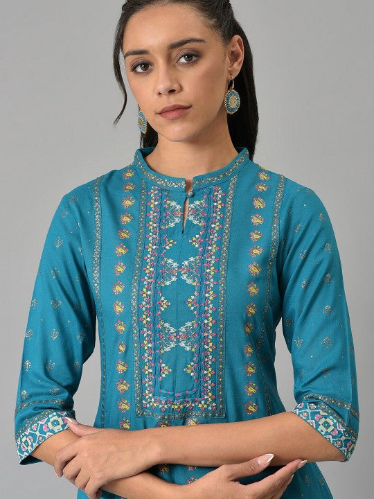 Product Details: Blue printed Kurta with Trousers Kurta design: Geometric printed A-line shape Panelled style Mandarin collar, three-quarter regular sleeves Calf length length with straight hem Viscose rayon knitted and woven...