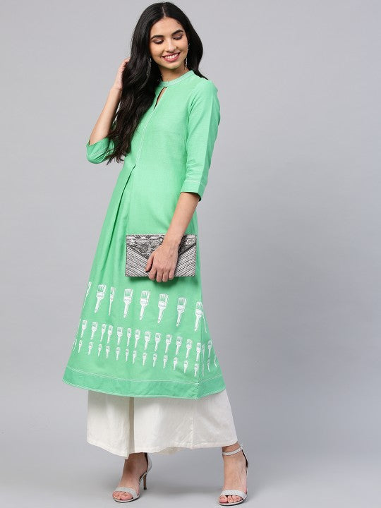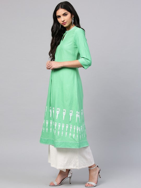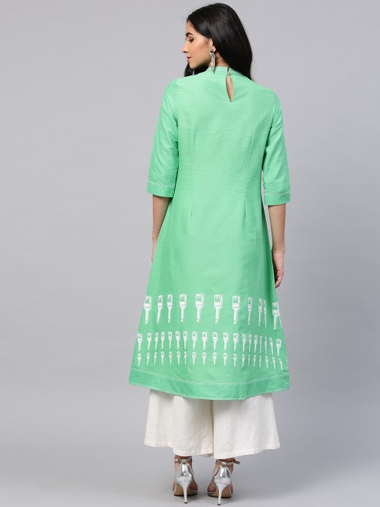 - Green printed A-line kurta, has a keyhole neck, three-quarter sleeves, flared hem