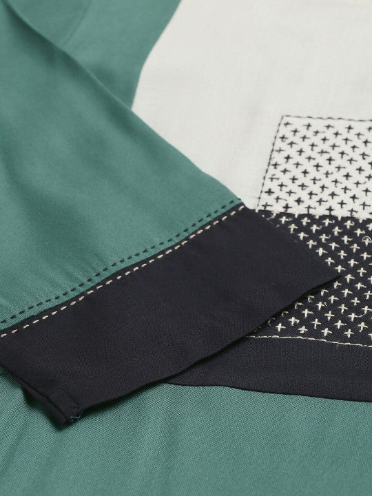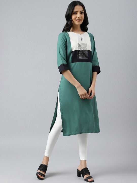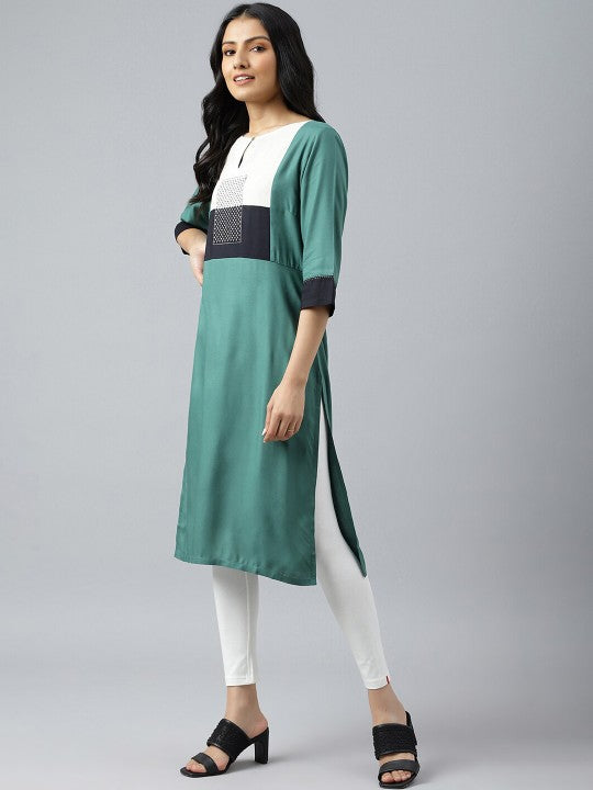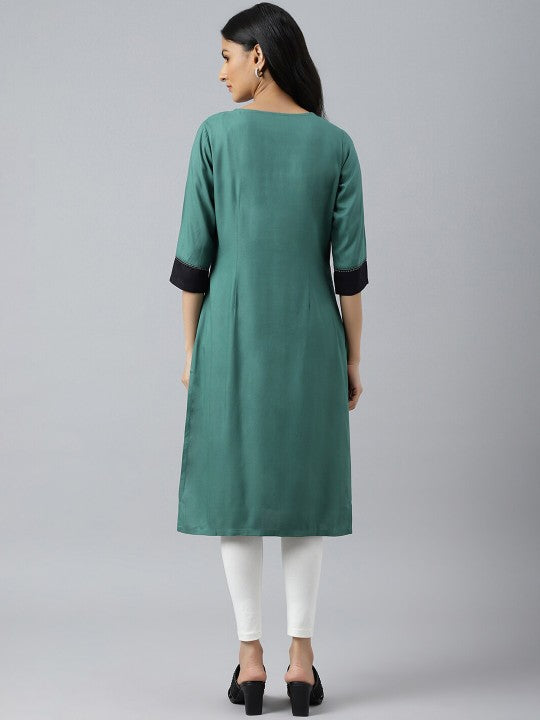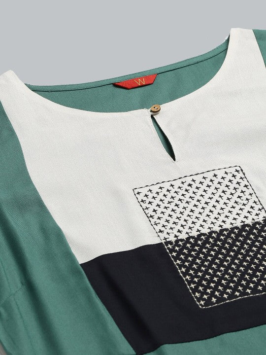 W Women Green Quirky Yoke Design Keyhole Neck Kurta