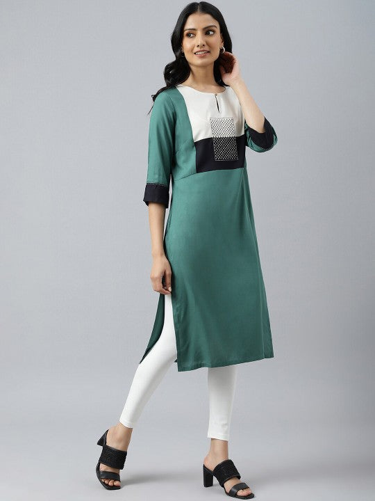 Product Details: Colour: Green Quirky yoke design Keyhole neck Three-quarter, regular sleeves Straight shape with regular style Calf length with straight hem Knitted and woven regular viscose rayon Material & Care:...