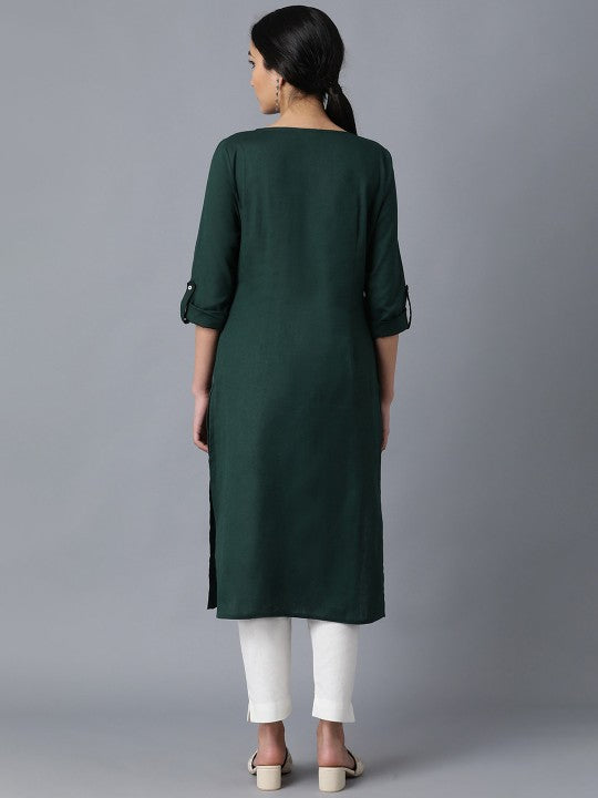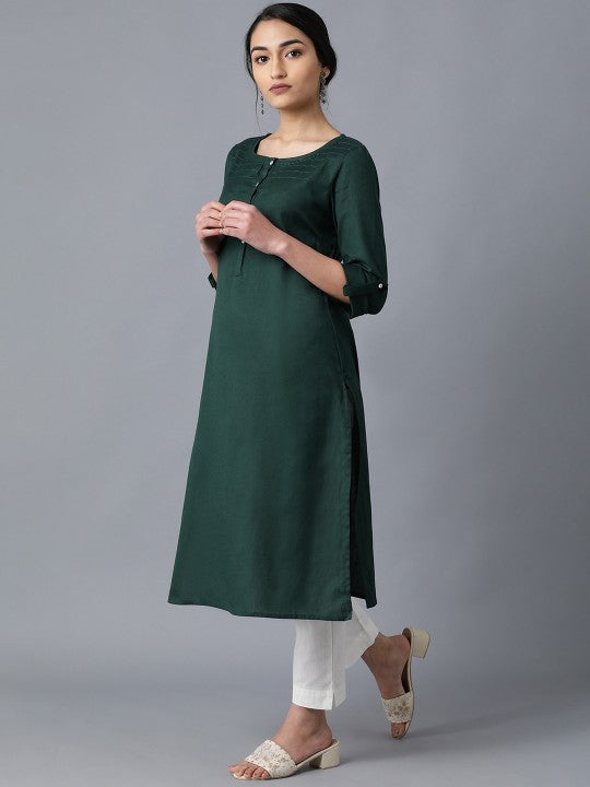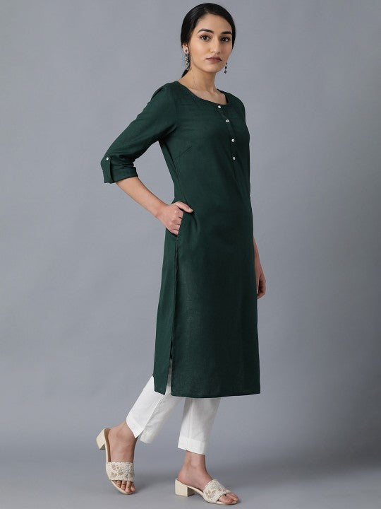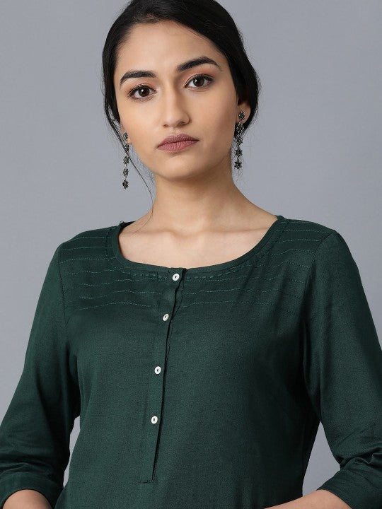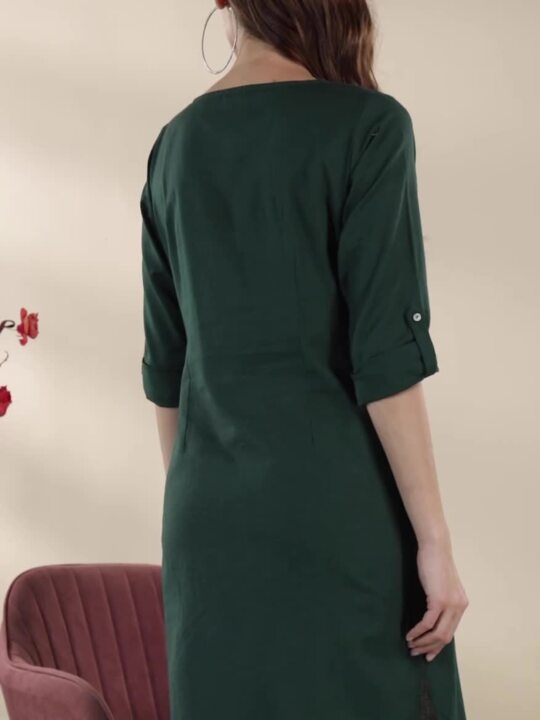 Product Details: Colour: Green Solid Round neck Three-quarter, regular sleeves A-line shape with regular style Calf length with straight hem Machine weave regular cotton Material & Care: Fabric Composition : 88%...