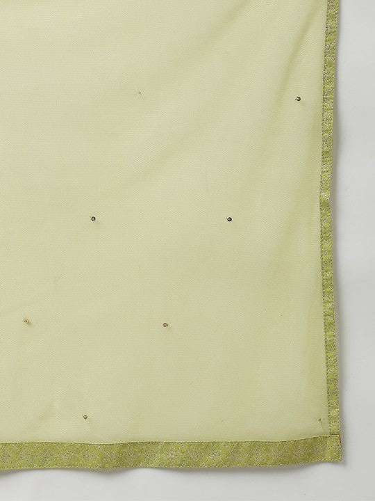 Product Details: Green and silver-toned solid dupatta, taping border Size & Fit: Length: 2.25 Mtr Width: 96.52 cm Material & Care: 100% Manmade Fiber Dry Clean