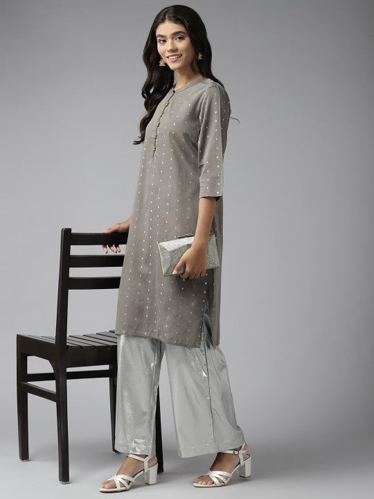 Product Details: Colour: Grey and Golden Ethnic motifs printed Mandarin collar Three-quarter, regular sleeves Straight shape with regular style Knee length with straight hem Machine weave regular viscose rayon Material &...