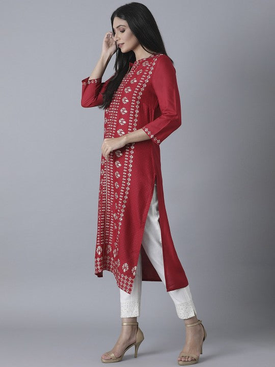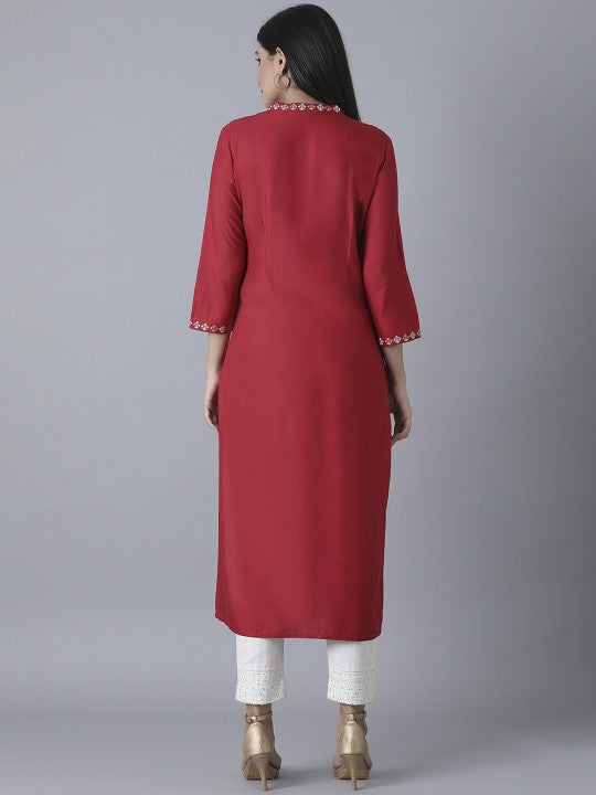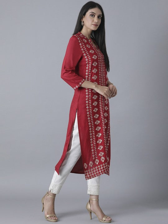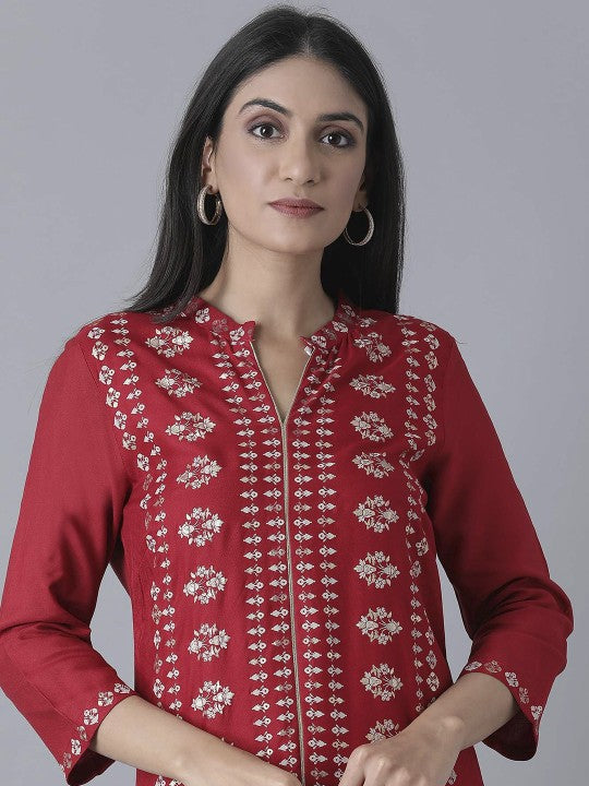 Product Details: Colour: Maroon Ethnic motifs printed Mandarin collar regular sleeves straight shape with regular Calf length with straight hem Knitted and woven regular viscose rayon Material & Care: 100% Viscose Hand...