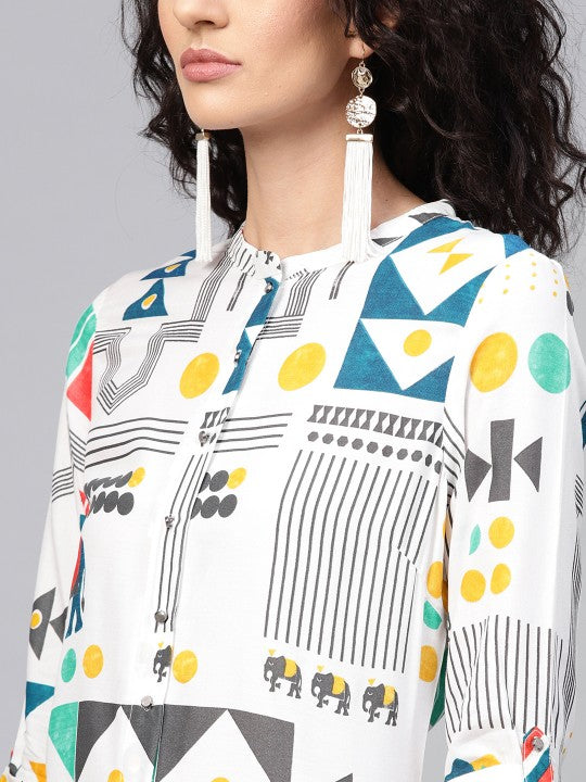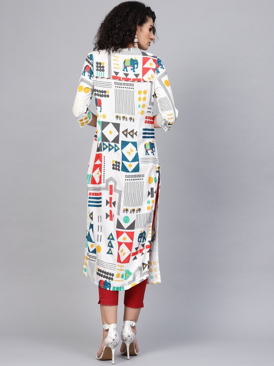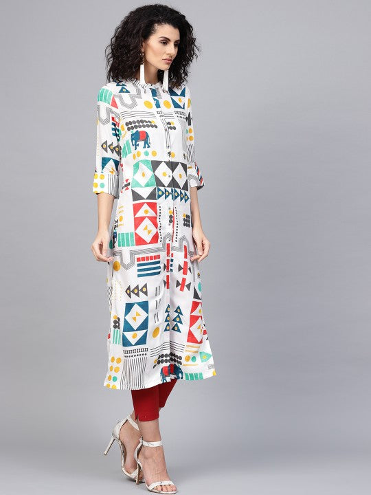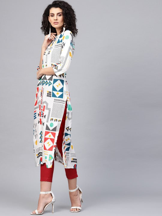 Product Details: Multicoloured printed A-line kurta, has a mandarin collar, three-quarter sleeves, straight hem, multiple slits, button closure Material & Care: Viscose Rayon Machine-wash