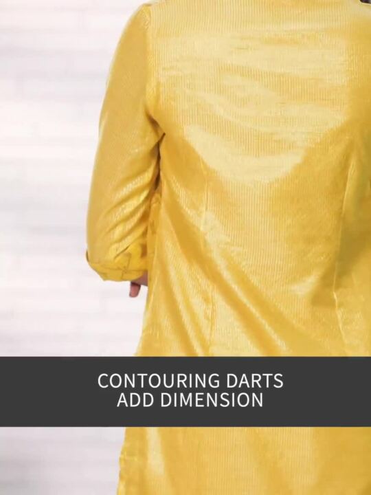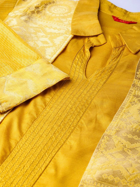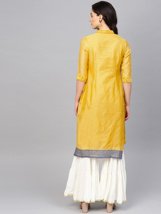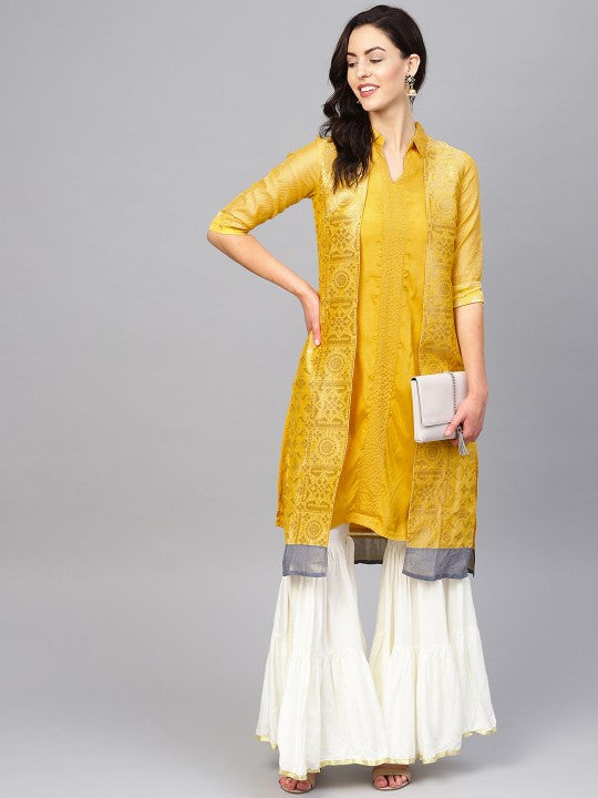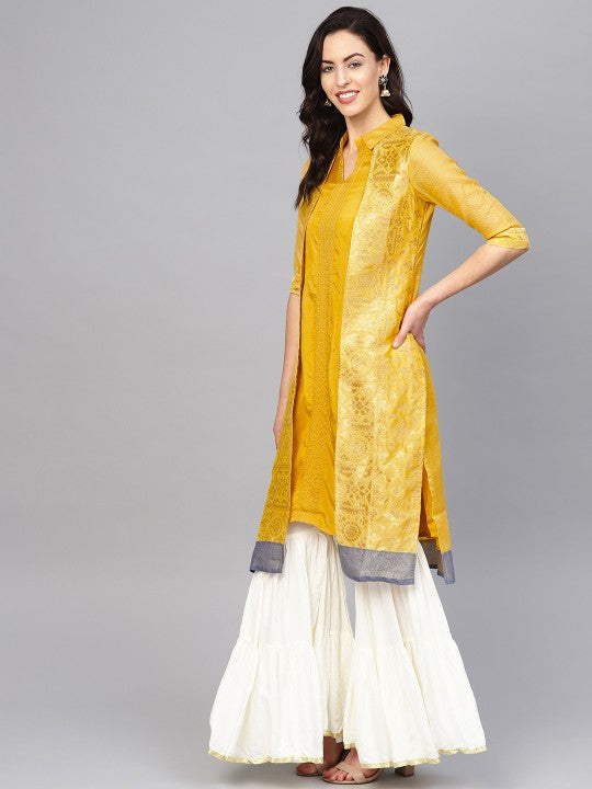 - Mustard yellow and golden zari work layered straight kurta , has a shirt collar, short sleeves, straight hem, and side slits