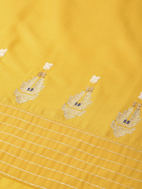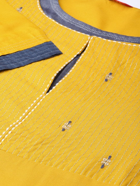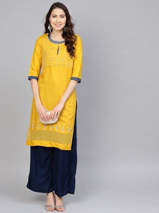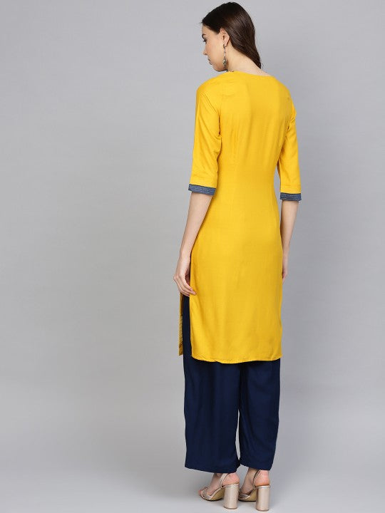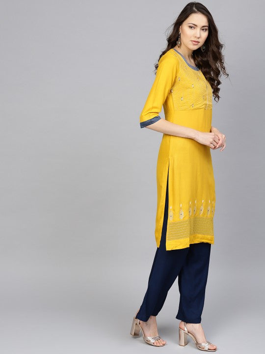Product Details: Mustard yellow yoke design straight kurta with embroidered and layered detail, has a round neck, three-quarter sleeves, straight hem, button closure and side slits Material & Care: Viscose Rayon...
