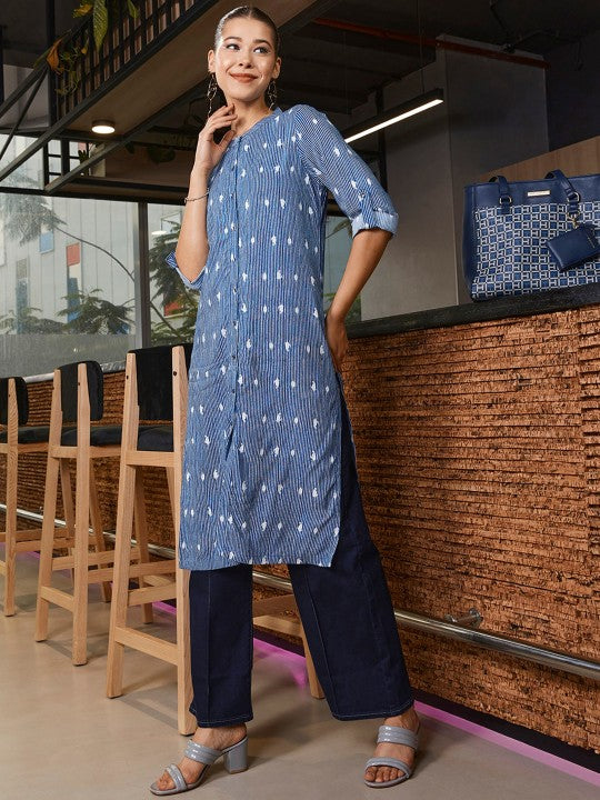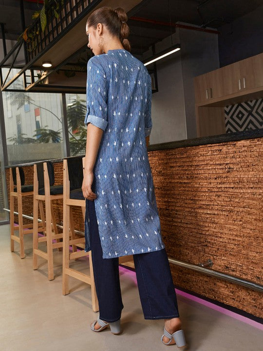 - Navy and white striped straight kurta with printed detail, has a mandarin collar, button closures, three-quarter sleeves, straight hem, and multiple slits