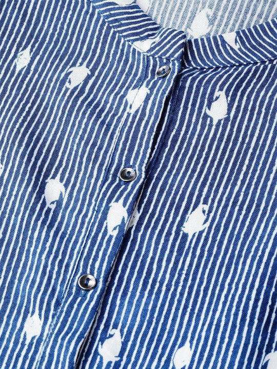 Product Details: Navy and white striped straight kurta with printed detail, has a mandarin collar, button closures, three-quarter sleeves, straight hem, and multiple slits Material & Care: Material: Liva Machine Wash...