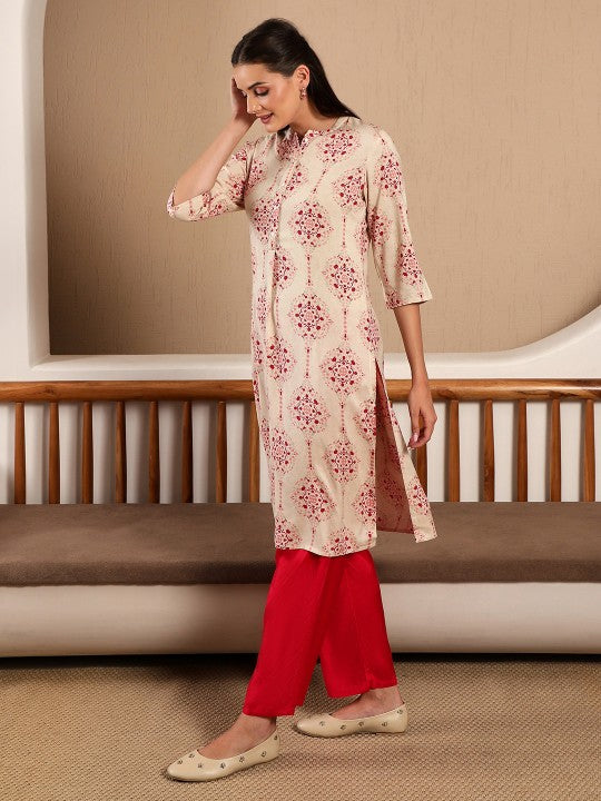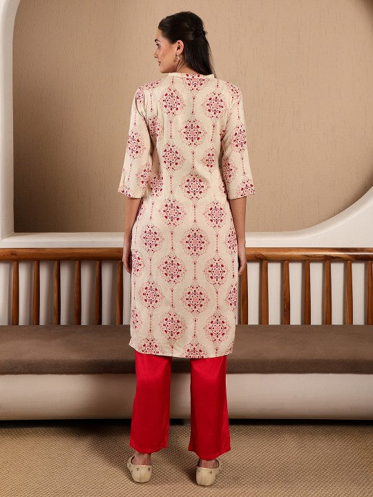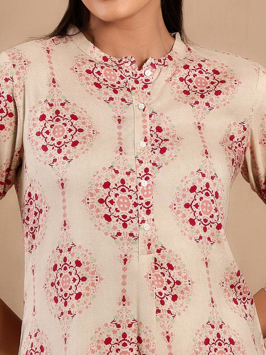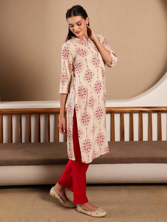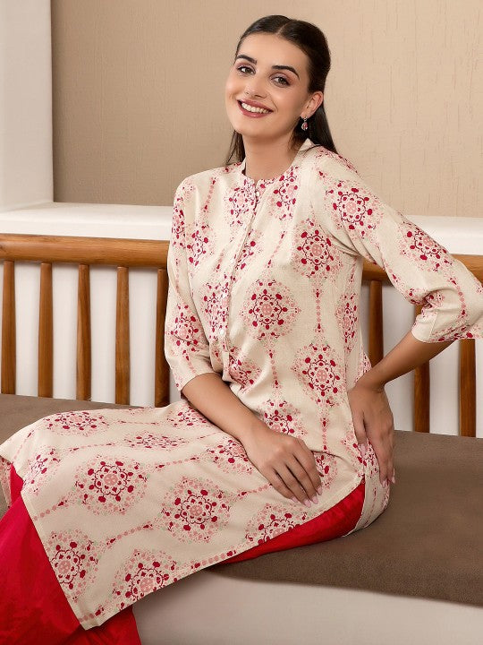 Product Details: Colour: Off White and Pink Ethnic motifs printed Mandarin collar Button closure Three-quarter, regular sleeves Straight shape with side slits Calf length with straight hem Machine weave regular viscose...