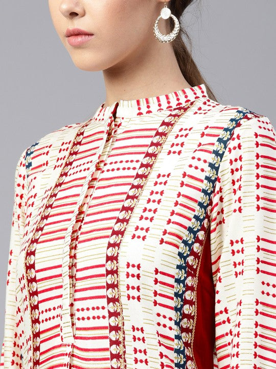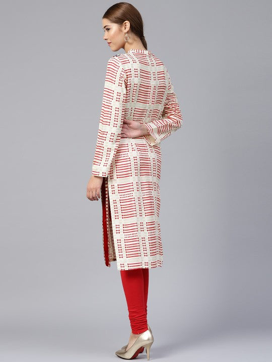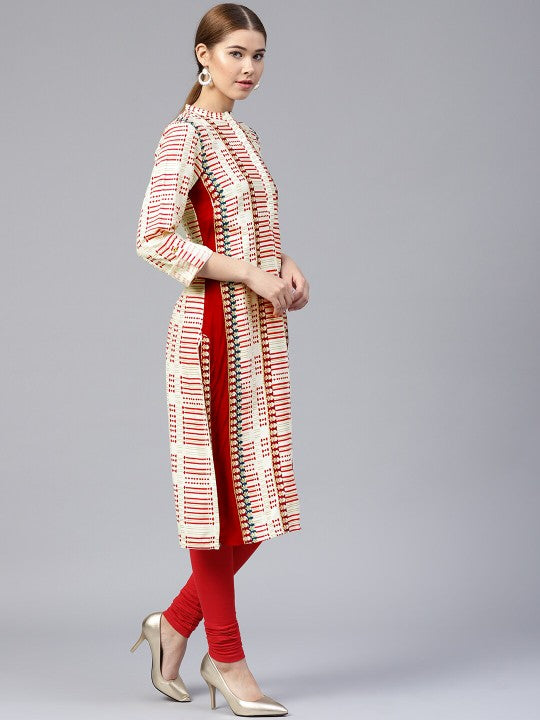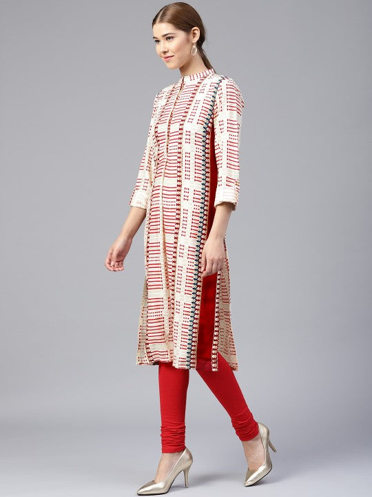 - Off-white and red printed straight kurta, has a mandarin collar, three-quarter sleeves, concealed button placket on the front, straight hem, side slits