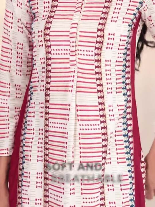 Product Details: Off-white and red printed straight kurta, has a mandarin collar, three-quarter sleeves, concealed button placket on the front, straight hem, side slits Material & Care: Fabric: 100% Viscose Rayon...