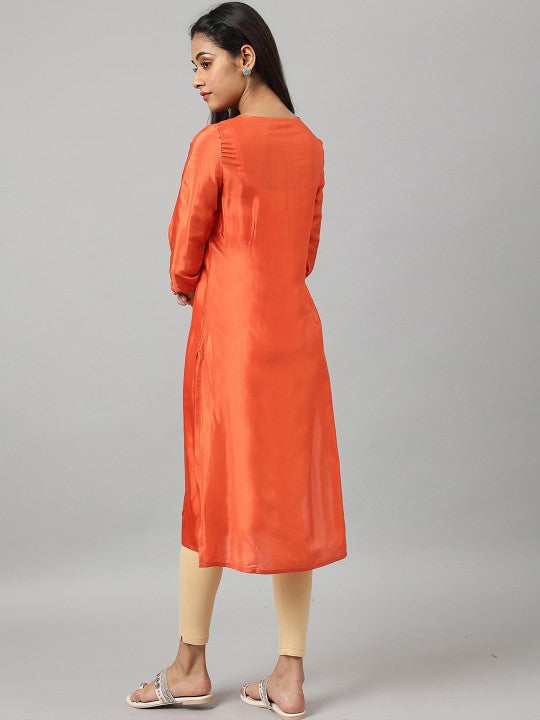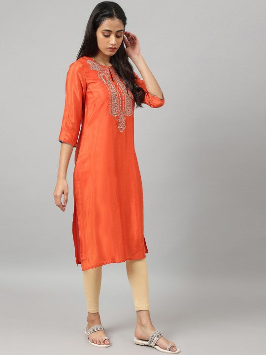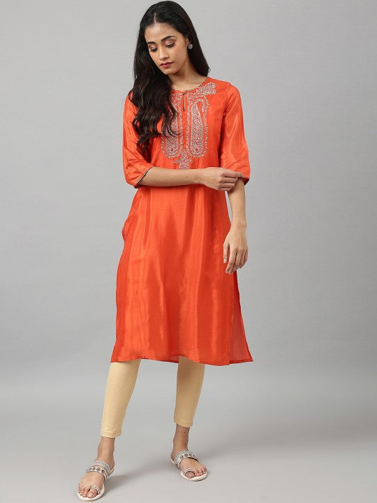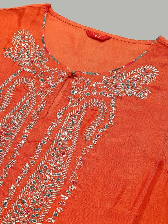 W Women Orange Embroidered Keyhole Neck Indie Prints Kurta