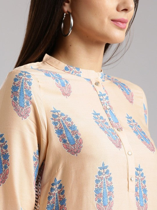 - Peach-coloured and blue printed straight kurta, has a mandarin collar, three-quarter sleeves, straight hem, side slits