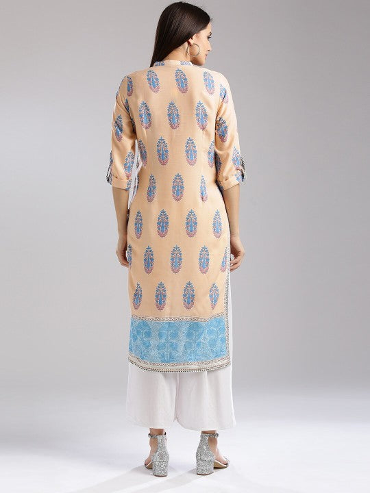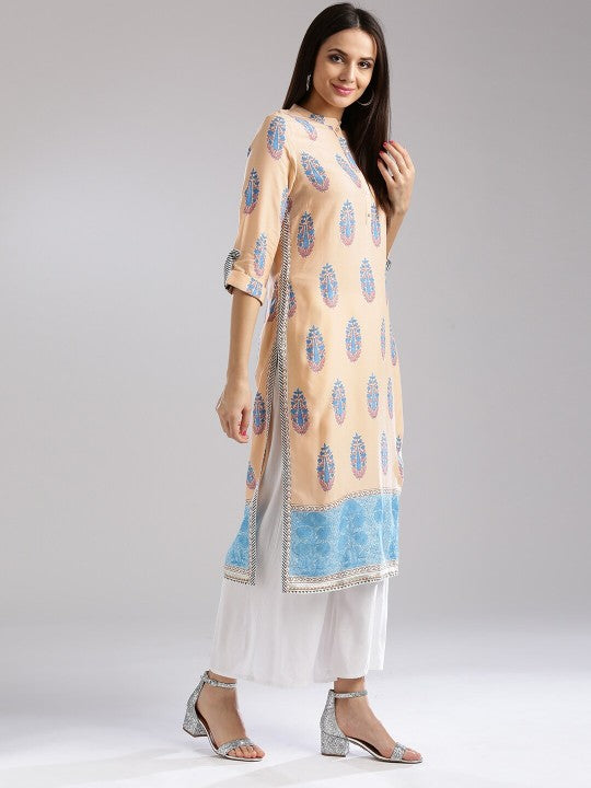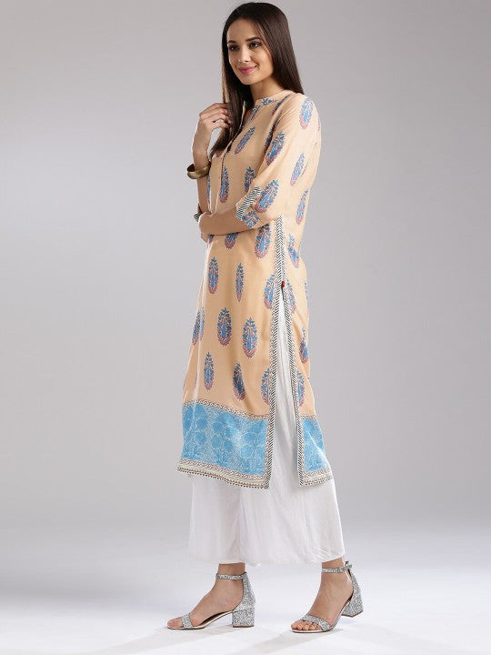 W Women Peach-Coloured & Blue Printed Straight Sustainable Kurta