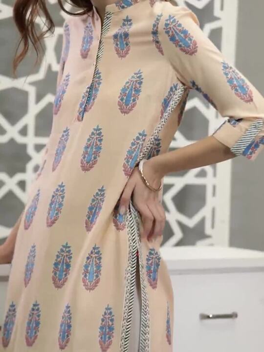 Product Details: Peach-coloured and blue printed straight kurta, has a mandarin collar, three-quarter sleeves, straight hem, side slits Material & Care: 100% Viscose Fabric type: Liva Dry Clean Only
