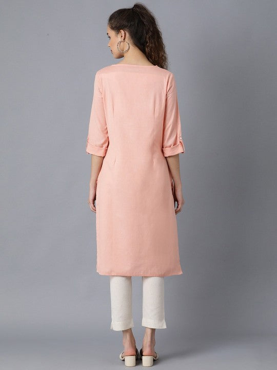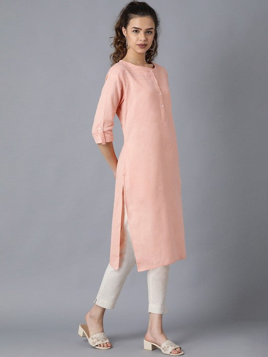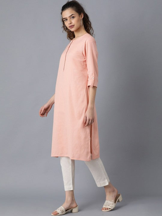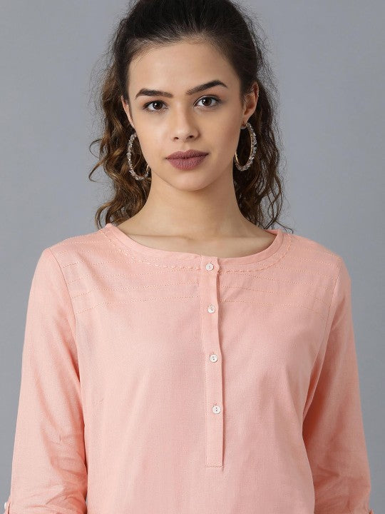 Product Details: Colour: Peach-coloured Solid Round neck Three-quarter, regular sleeves A-line shape with regular style Calf length with straight hem Machine weave regular cotton Material & Care: Fabric Composition : 88%...