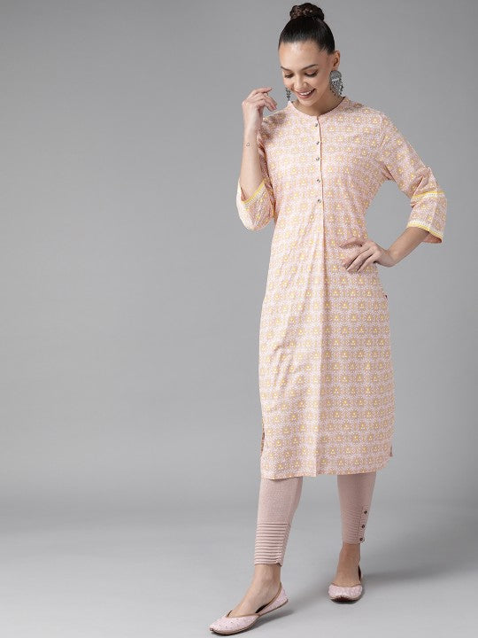 Product Details: Colour: Peach-coloured and white Ethnic printed Mandarin collar Three-quarter, regular sleeves Straight shape with regular style Knee length with straight hem Machine weave regular viscose rayon Material & Care:...
