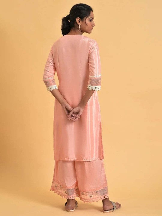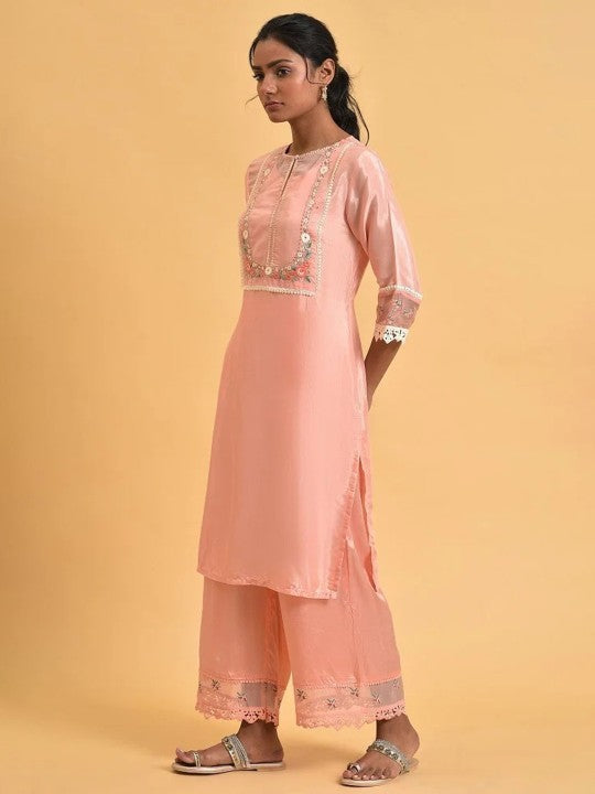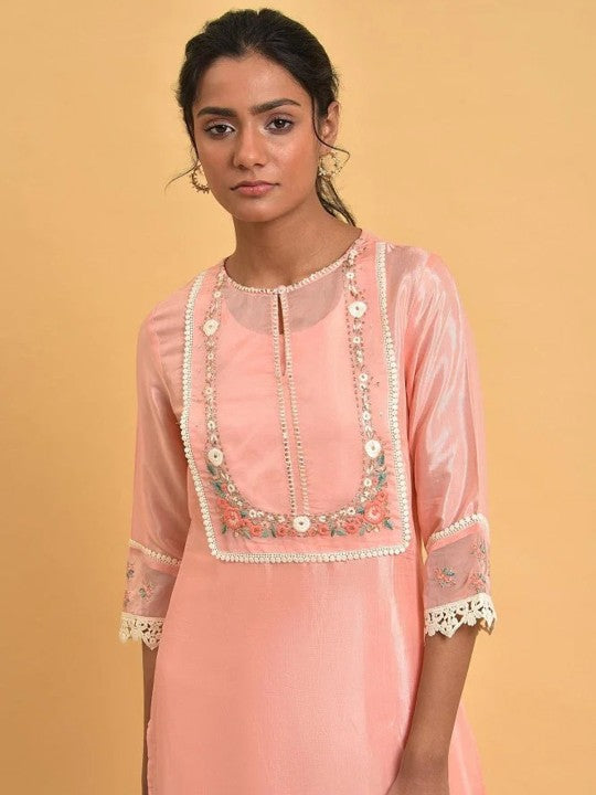 Product Details: Colour: Pink Floral yoke design Keyhole neck Three-quarter, regular sleeves Straight shape with regular style Thread work detail Knee length with straight hem Knitted and woven regular viscose rayon...