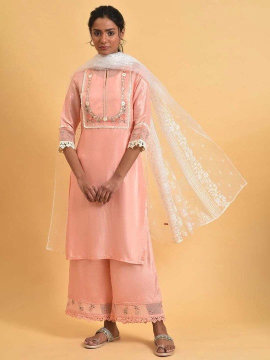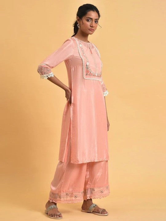 W Women Pink Floral Yoke Design Keyhole Neck Thread Work Kurta