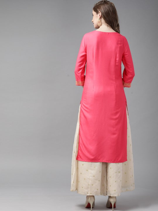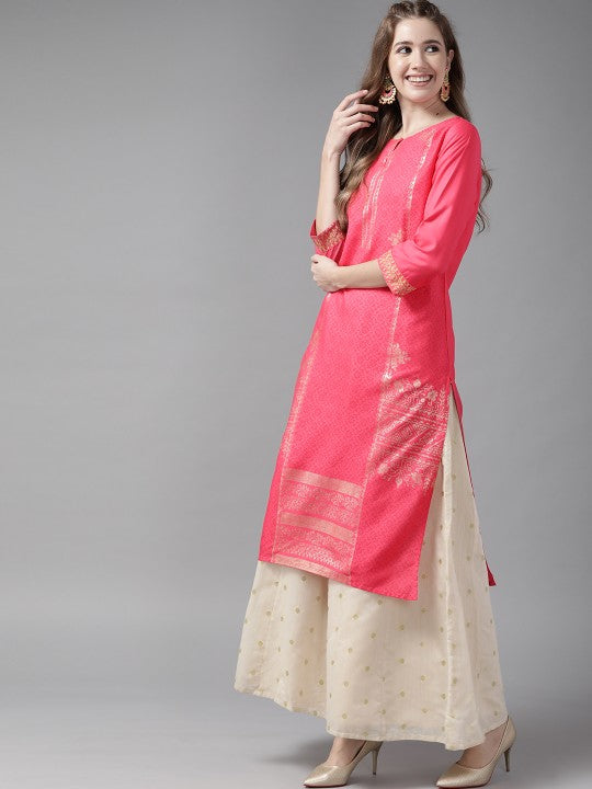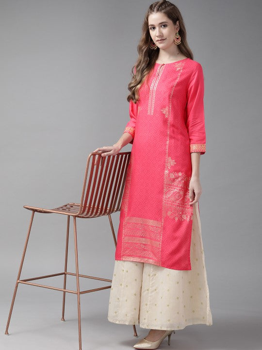 Product Details: Colour: Pink and Golden Ethnic motifs printed Keyhole neck Three-quarter, regular sleeves Straight shape with regular style Side slits Knee length with straight hem Machine weave regular viscose rayon...