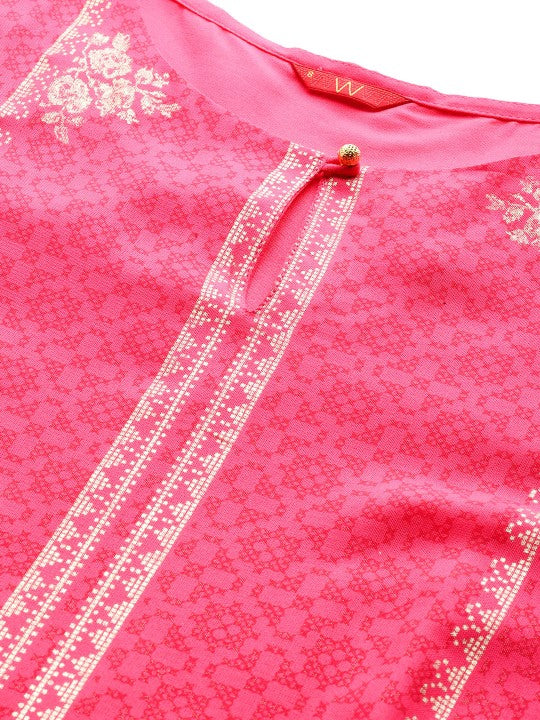 W Women Pink & Golden Ethnic Motifs Print Keyhole Neck Straight Kurta