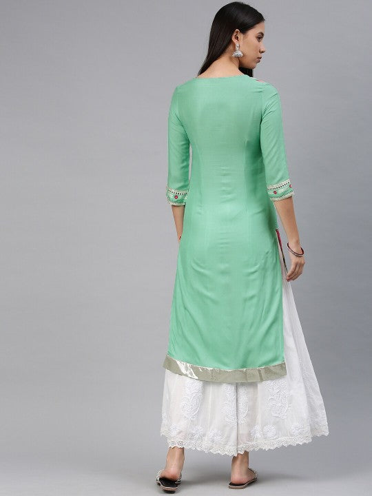 Product Details: Sea green printed straight kurta with sequinned detail, has a round neck, three-quarter sleeves, straight hem, side slits Material & Care: 100% Viscose Fabric type: Liva Dry Clean Only...