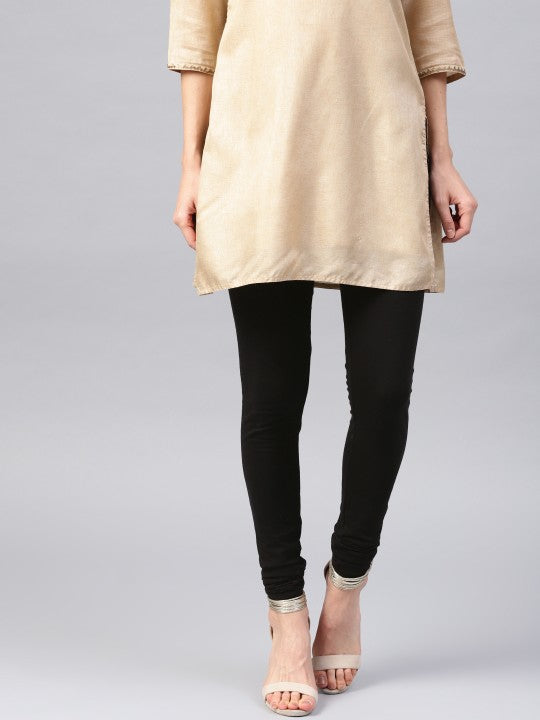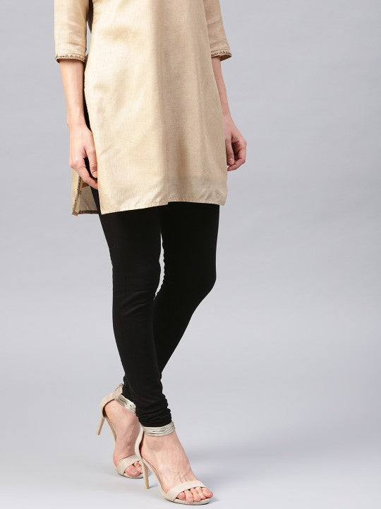 - A pair of black solid churidar leggings, has an elasticated waistband