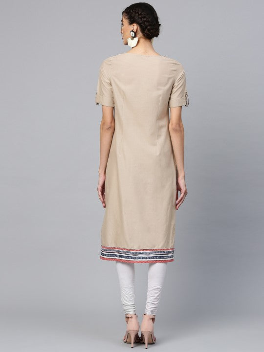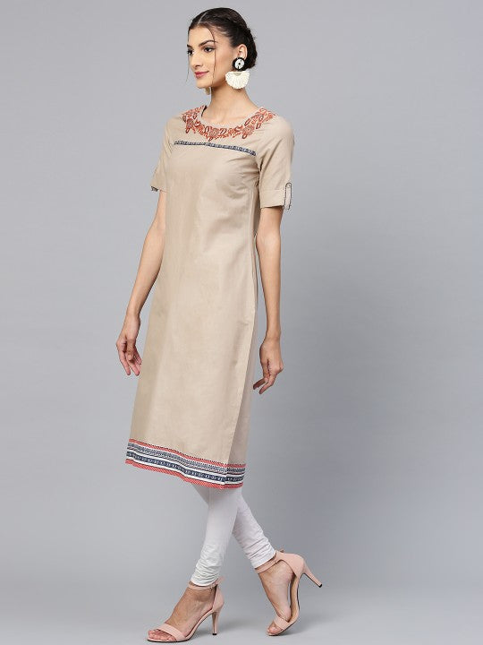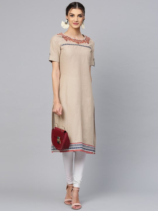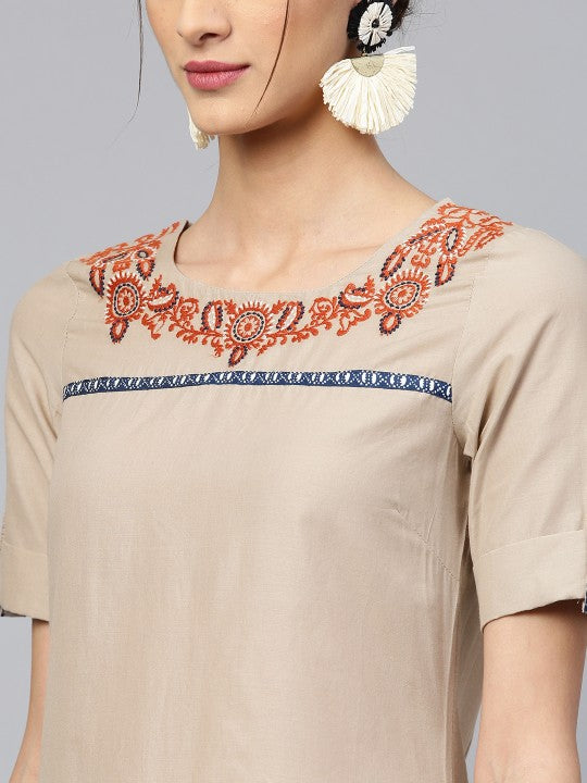 - Taupe solid straight kurta, has a round neck with embroidered detail, short sleeves, straight hem, side slits
