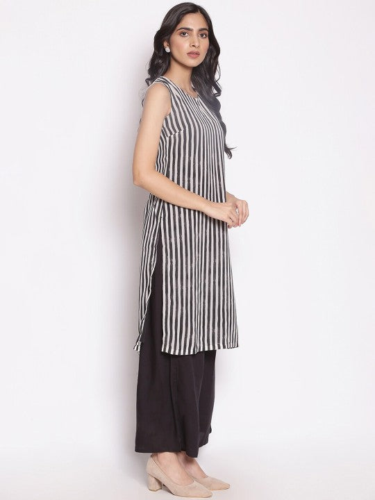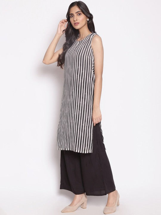 Product Details: Colour: White and Black Striped Boat neck Sleeveless, no sleeves A-line shape with regular style Knee length with curved hem Knitted and woven regular polyester Material & Care: Fabric...