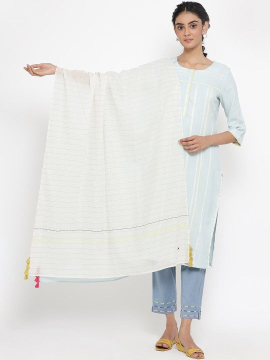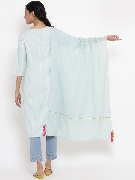 Product Details: Blue and blue solid striped dupatta, tasselled border Size & Fit: Length: 2.25 Width: 36 inch Material & Care: Fabric Name : Dobby Fabric Composition : 100 % Cotton Machine ...