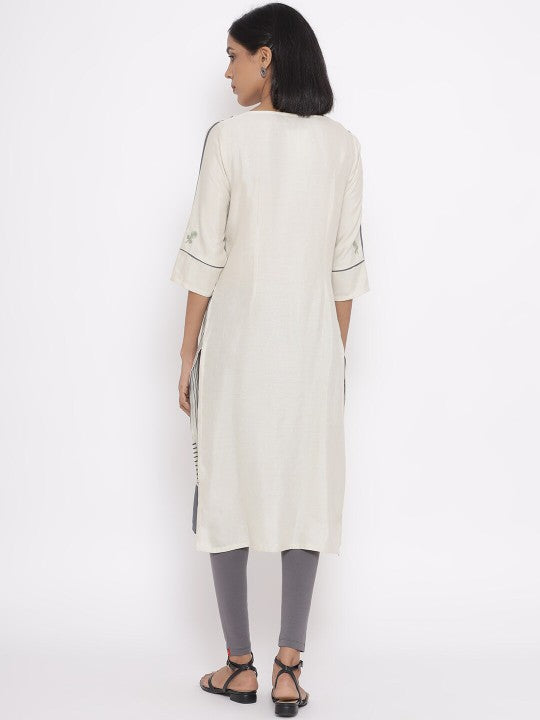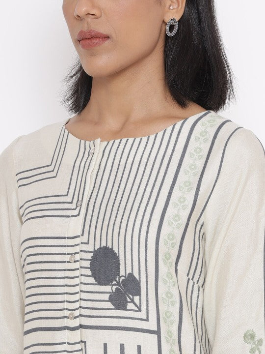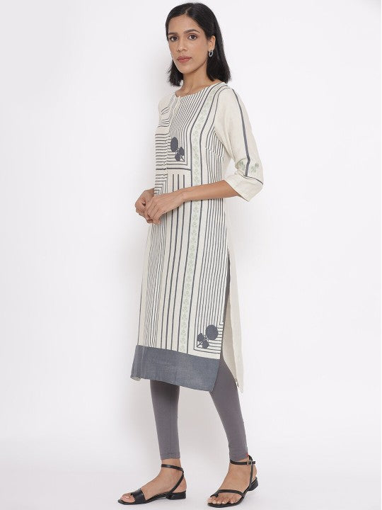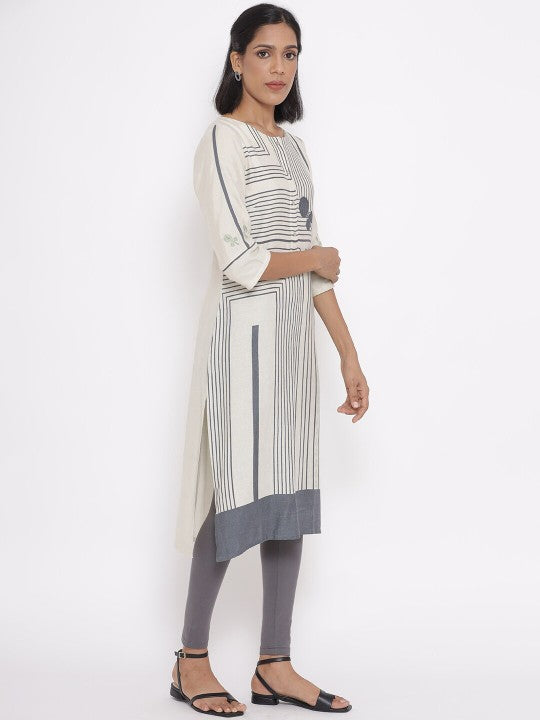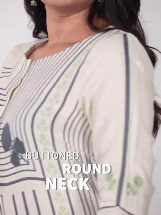 Product Details: Colour: White and Grey Striped Round neck Three-quarter, regular sleeves A-line shape with regular style Calf length with straight hem Knitted and woven regular viscose rayon Material & Care:...