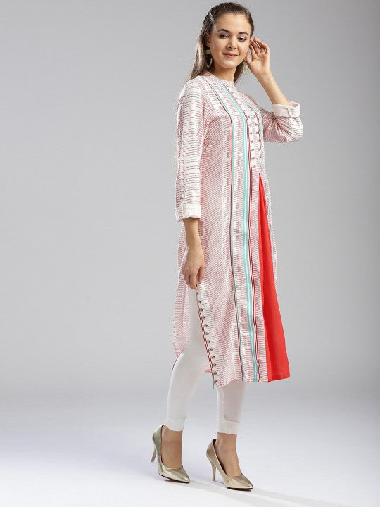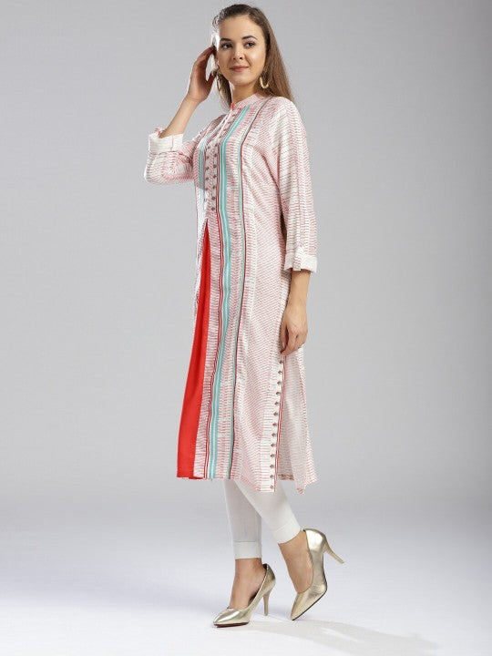 Product Details: White and red printed straight kurta, has a mandarin collar, three-quarter sleeves, straight hem, side slits Material & Care: Fabric: 100% Viscose Rayon Fabric Type: Liva Dry-clean
