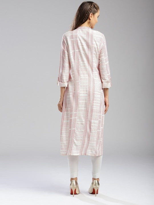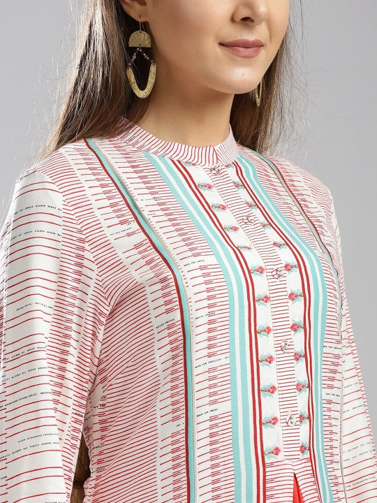 - White and red printed straight kurta, has a mandarin collar, three-quarter sleeves, straight hem, side slits