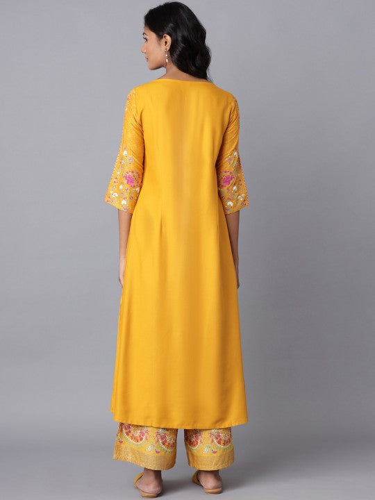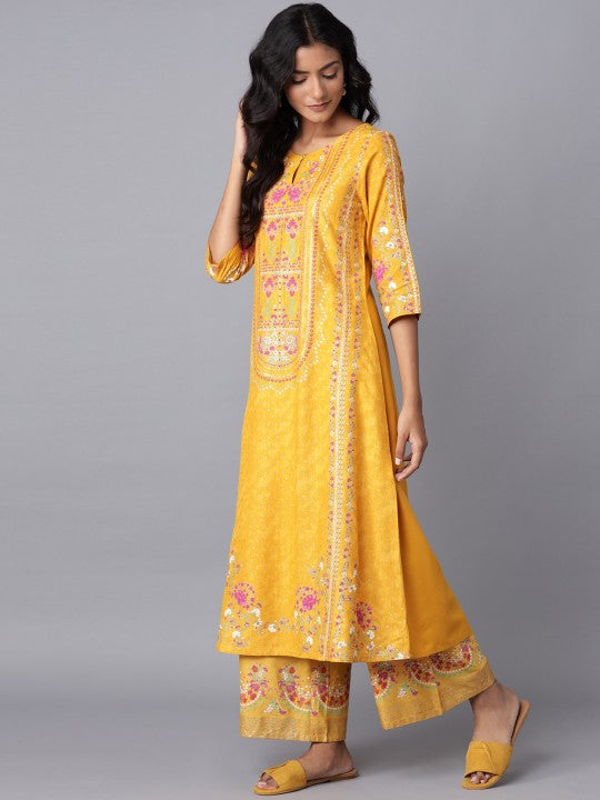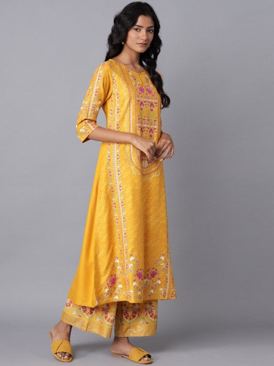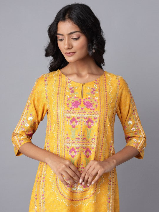 Product Details: Colour: Yellow Floral printed Round neck Three-quarter, regular sleeves A-line shape with regular style Calf length with flared hem Knitted and woven regular viscose rayon Material & Care: Fabric...