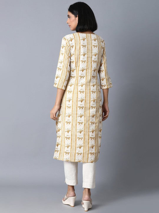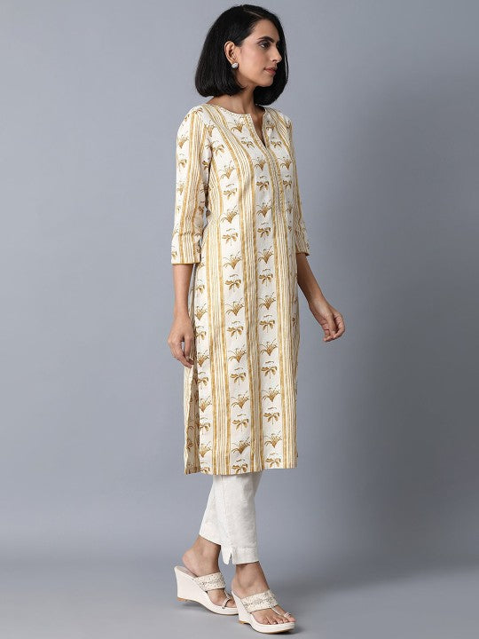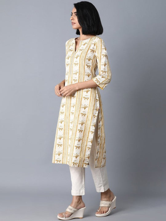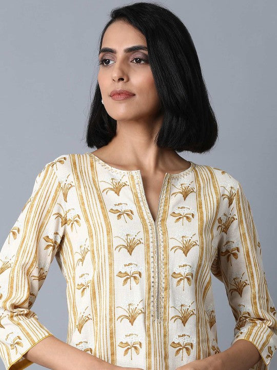 Product Details: Yellow straight shape with three-quarter regular sleeves v-neck calf length regular style machine weave cotton Material & Care: Cotton Hand Wash