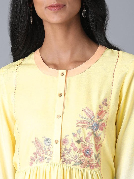 Product Details: Yellow and white yoke design straight kurta, has a round neck, three-quarter sleeves, straight hem, button closure and side slits Material & Care: Material: Livaeco Machine Wash